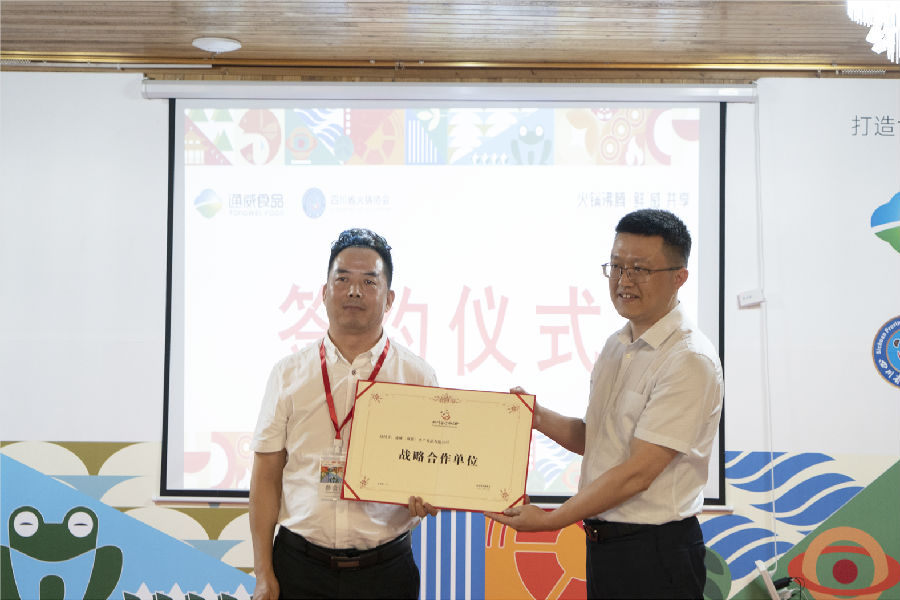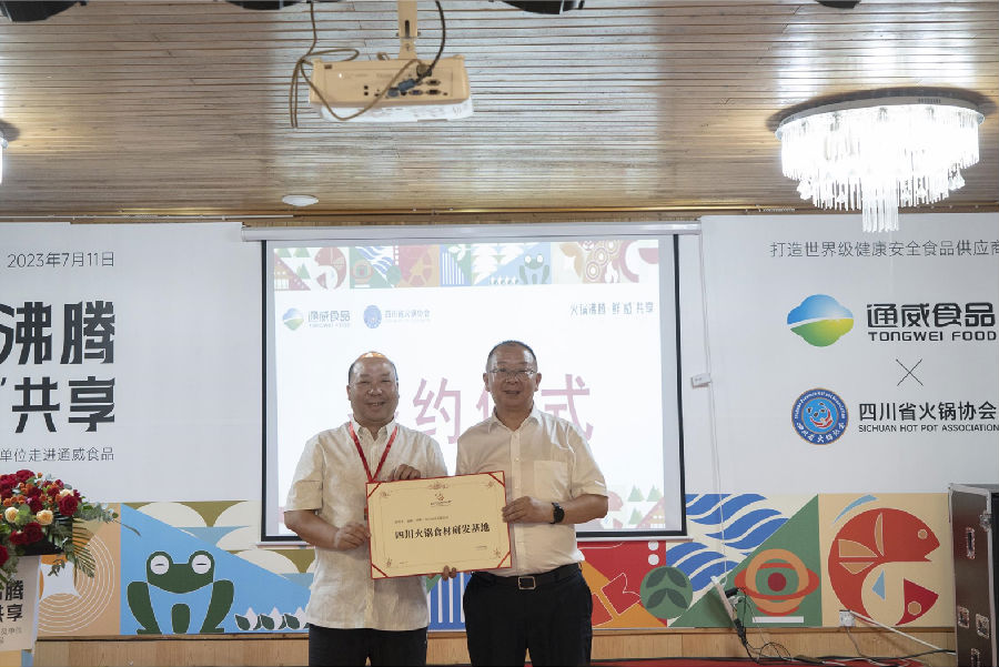 會議最後舉行了合作簽約儀式,火鍋協會現場授予四川通威食品有限公司“戰略合作單位”、授予通威(成都)水産食品有限公司“四川火鍋食材研發基地”。