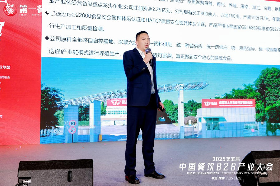 頒獎環節之後,晚宴進入了美食品鑒環節。嘉賓們品嘗了由通威食品旗下新太豐農業公司精心準備的“太豐鴻運拌香雞”,其鮮嫩口感赢得與會嘉賓高度評價。同期,成都新太豐農業開發有限公司營銷總經理陳宗友發表演講,分享了公司的發展曆程與核心價值,并展示了通威食品對食材品質的嚴苛把控,這份深入供應鍊源頭的匠心,使得每一道菜品不僅風味出衆,更傳遞出企業對“從田間到餐桌”每個環節的極緻追求。