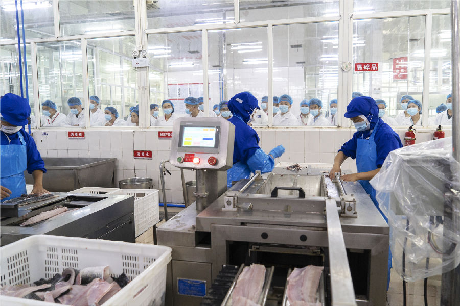 來賓一行随後實地考察了通威(成都)水産食品有限公司,了解了通威黑魚片的生産過程,來賓對通威食品加工廠标準化規範化生産流程高度贊賞。