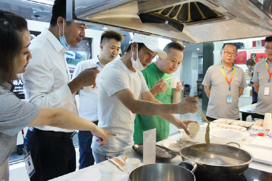 首先,陳總邀請建新餐飲公司領導團隊對公司産品進行品鑒。建新餐飲公司領導團隊對通威食品旗下的蝦滑、蝴蝶蝦、蝦仁、烏魚片、脆羅非魚片、魚丸等産品品質、口感贊不絕口,并表示通威食品現有很多産品系列都能應用到建新餐飲旗下的餐飲門店中。