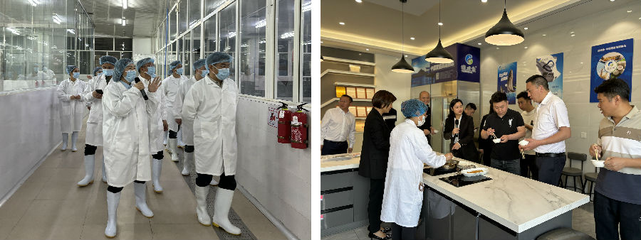 來賓一行在通威魚殷勇總經理的陪同下先後參觀了新津通威農博園、通威(成都)水産食品有限公司、通威魚園區基地、TIC國際中心,詳細了解了通威食品加工廠标準化加工流程和檢測流程,并對産品進行品鑒。