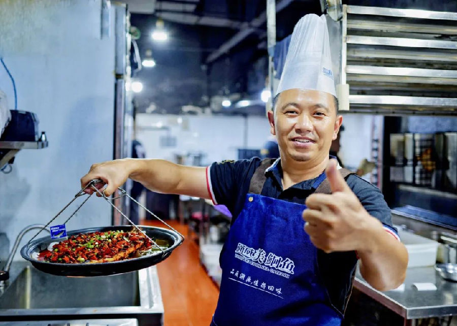 烤魚後廚采用明檔,每位消費者可以清晰看見鋪底,烤制呈盤,上料烹燴全過程。通過采訪大廚,可以了解到荊都烤魚以“入味”聞名,料汁不流連在表面,還深入蒜瓣狀魚肉的每個縫隙,就連浸在油湯裡的素菜,在保留爽脆的同時,也留下了與多種香料相擁的印迹。通威的鮰魚搭配匠心調味,确保每次出餐都讓食客吃得開心、吃得放心。