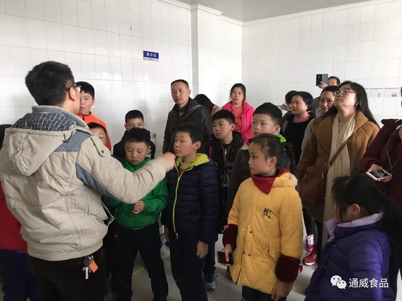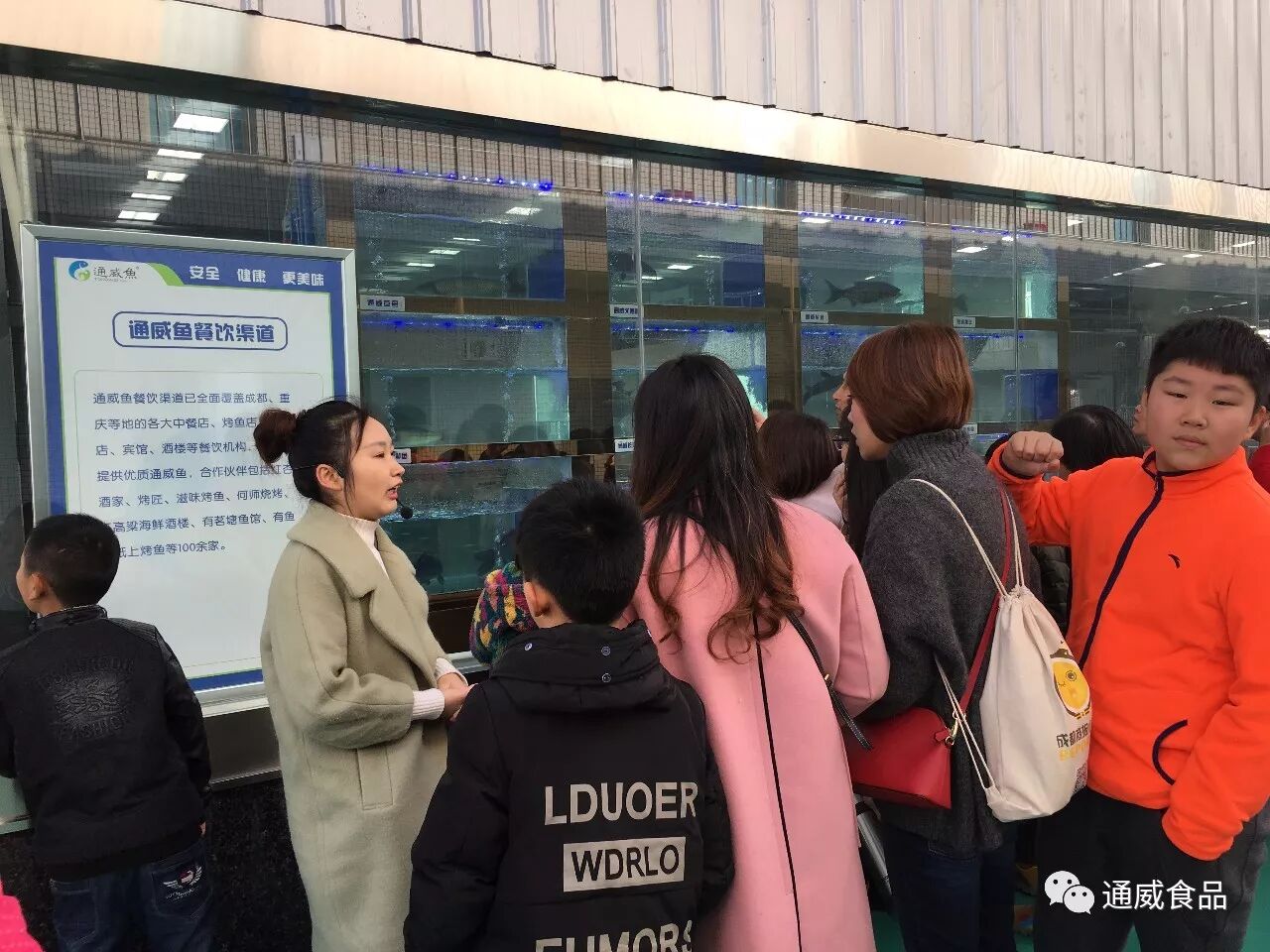 第一次到通威魚園區的小朋友們,對冒着氣泡的魚池和魚身的标簽充滿了好奇,通威魚講解員耐心的解答了他們的問題。