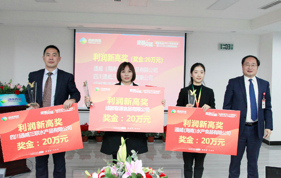 1月21日,通威食品召開2021年度表彰及2022年工作規劃會議。通威股份副董事長嚴虎、四川通威食品有限公司董事長兼總經理陳波、副總經理薛峰、總經理助理李天文及各公司總經理、中幹共計70餘人以“現場+視頻”的形式參加會議。